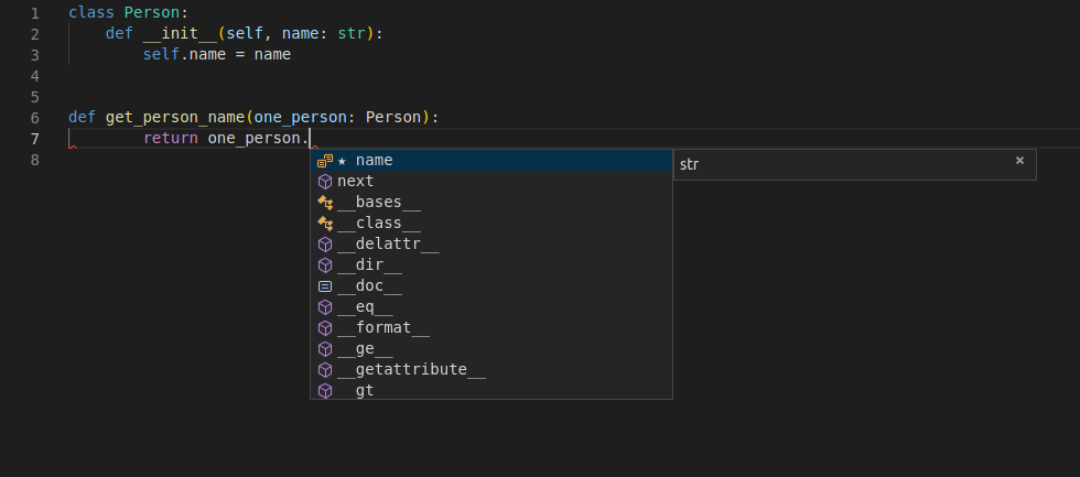 편집기가 변수의 타입을 알고 있기 때문에, 자동완성 뿐 아니라 에러도 확인할 수 있습니다: