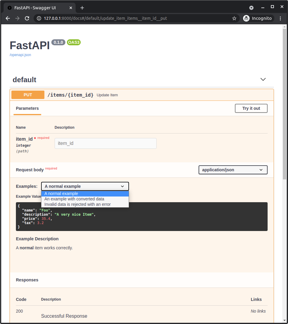 여기, Body()에 예상되는 예제 데이터 하나를 포함한 examples를 넘겼습니다:
